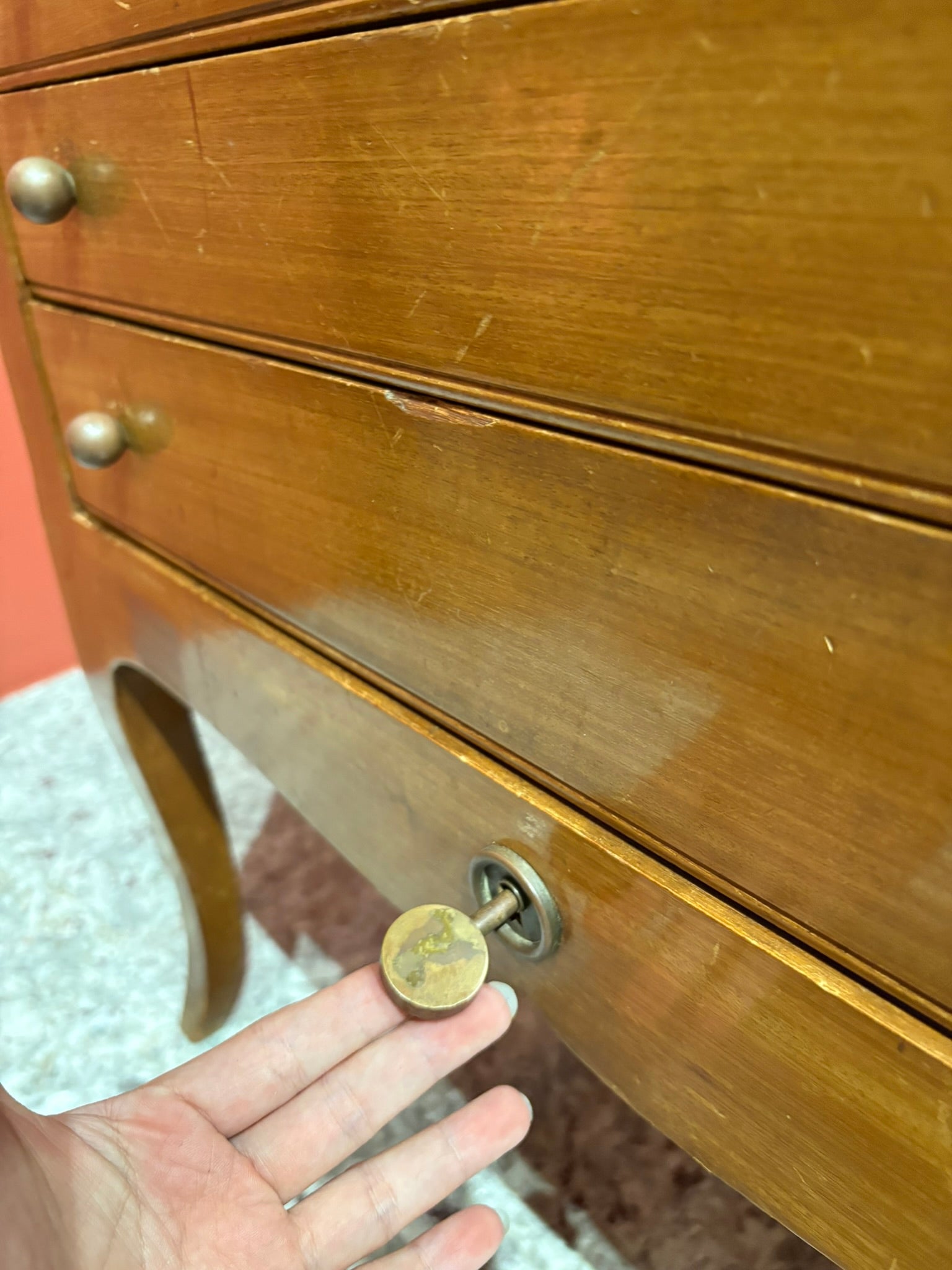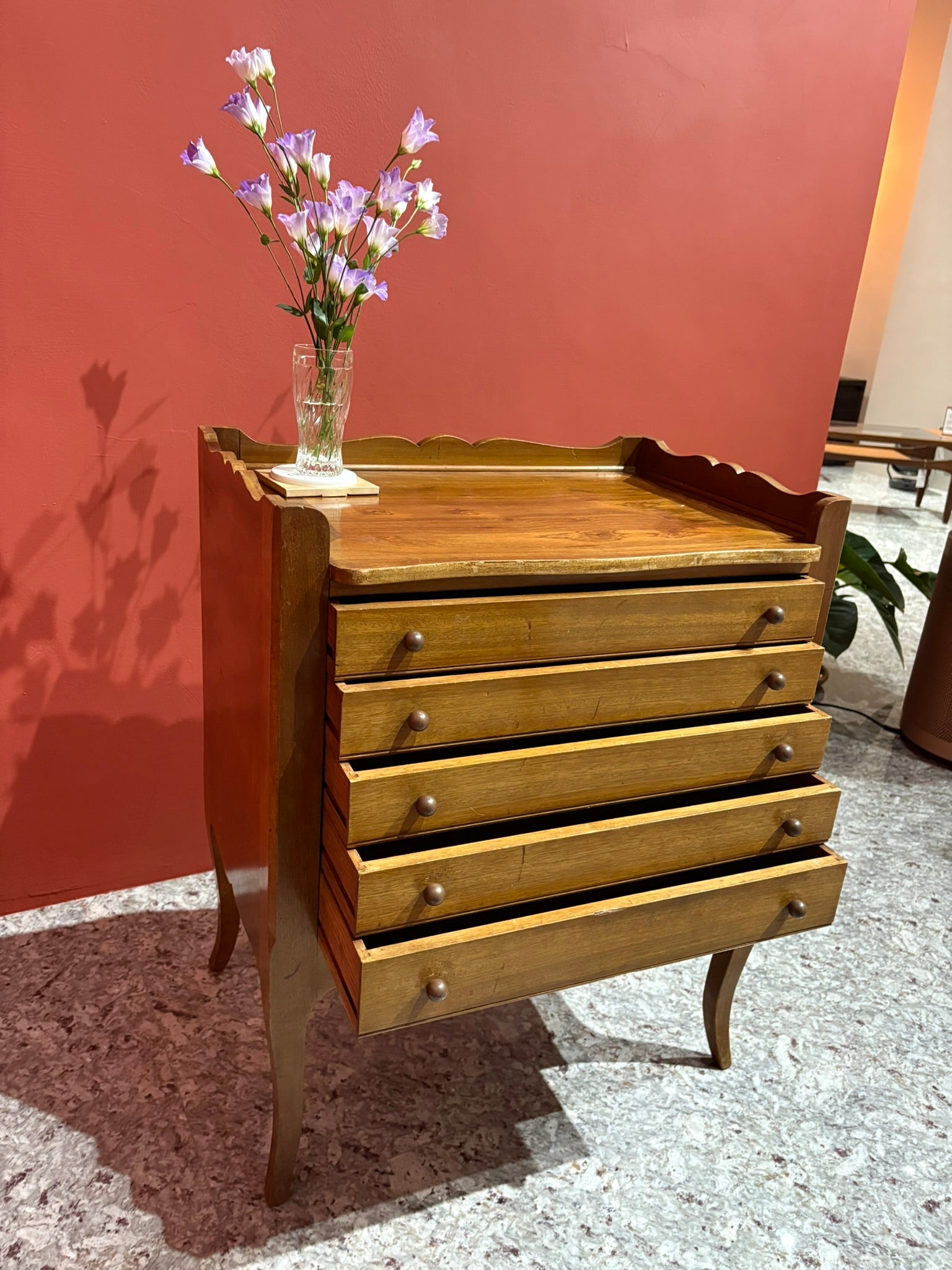 這件木製斗櫃來自二十世紀中期,整體線條帶有柔和的曲線感,搭配實木質地,呈現溫潤自然的氣質。