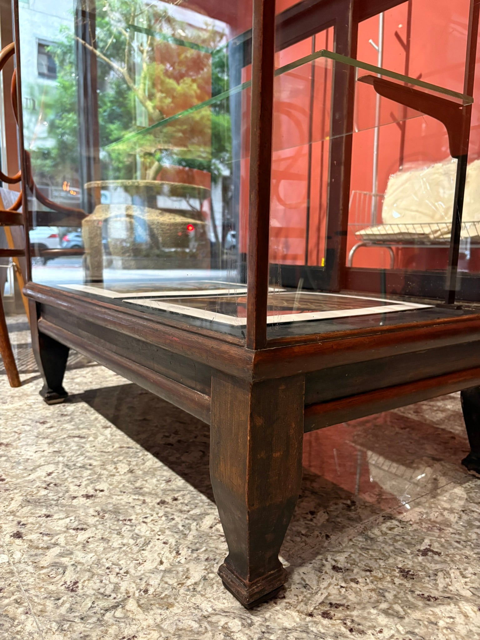 這件展示櫃來自英國,以桃花心木框架搭配四面玻璃製作。比例端正,結構穩固,內附層板,方便分層展示。