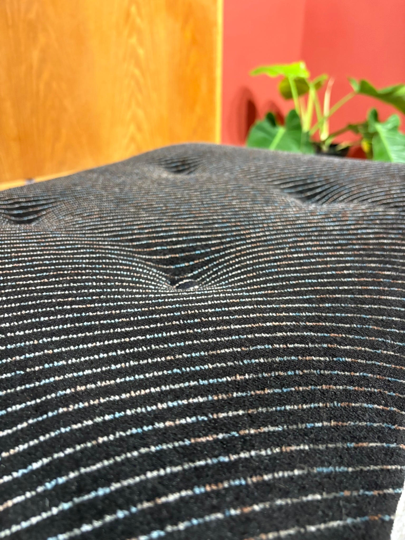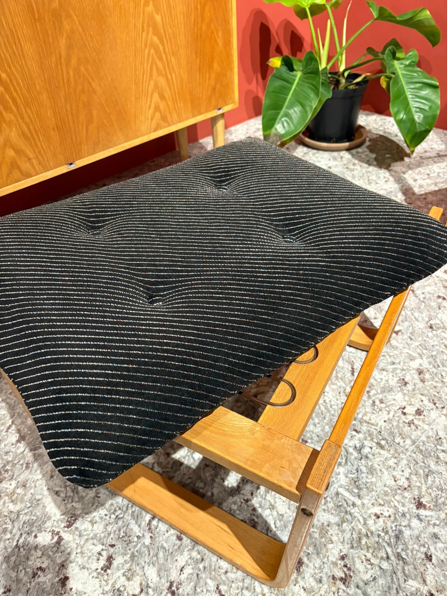 椅架以淺色山毛櫸(Beech wood)層壓成型,呈現柔和的曲線與穩定支撐;黑灰條紋布面厚實包覆,兼具溫潤與現代感。