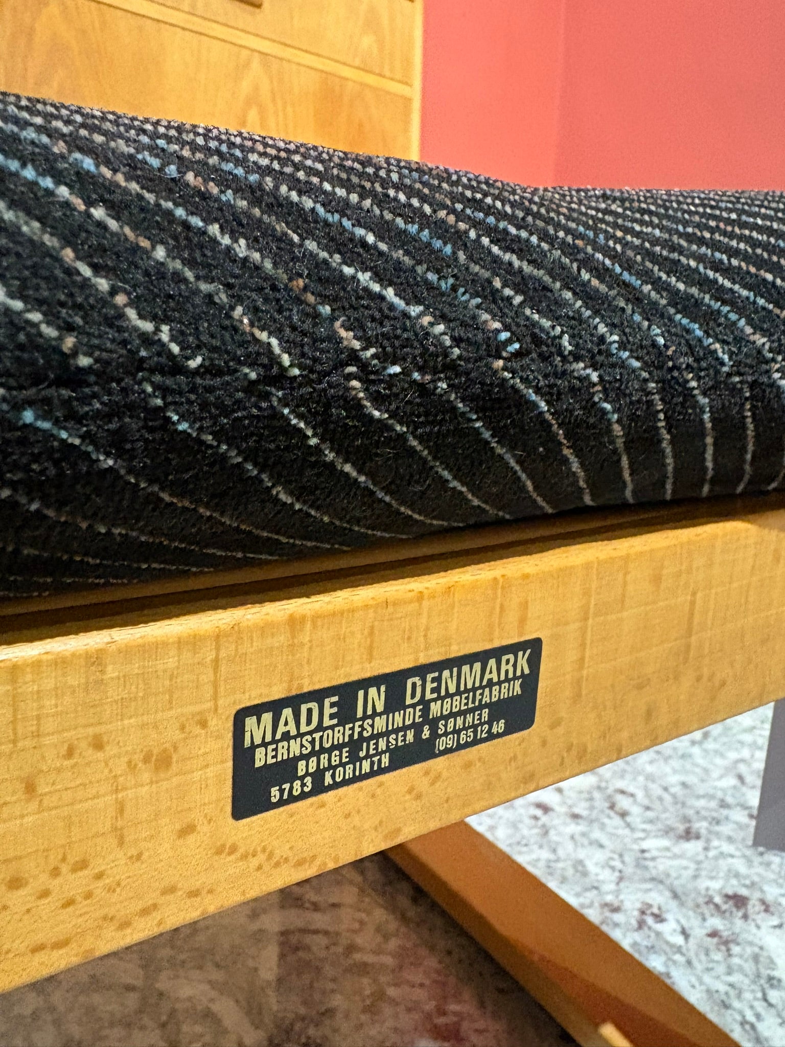 底部原廠標示「Made in Denmark — Bernstorffsminde Møbelfabrik, Børge Jensen & Sønner, 5783 Korinth」,為當時的黑底銀字金屬銘牌,是該工廠 1970 年代至 1980 年代初期的典型識別。