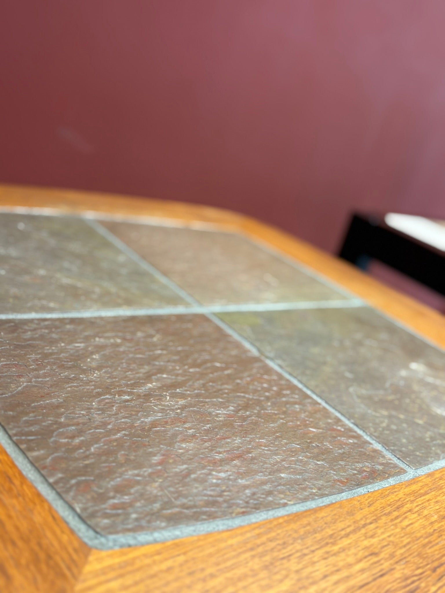 桌面以 四塊陶磚(tile)嵌入柚木實木框架,陶磚表面呈現自然礦物紋理與溫潤霧面光澤,與柚木的暖棕色木紋形成柔和對比。圓角桌緣與圓柱形桌腳使整體比例圓潤輕盈,兼具穩定結構與柔和造型,展現丹麥工藝特有的平衡感。