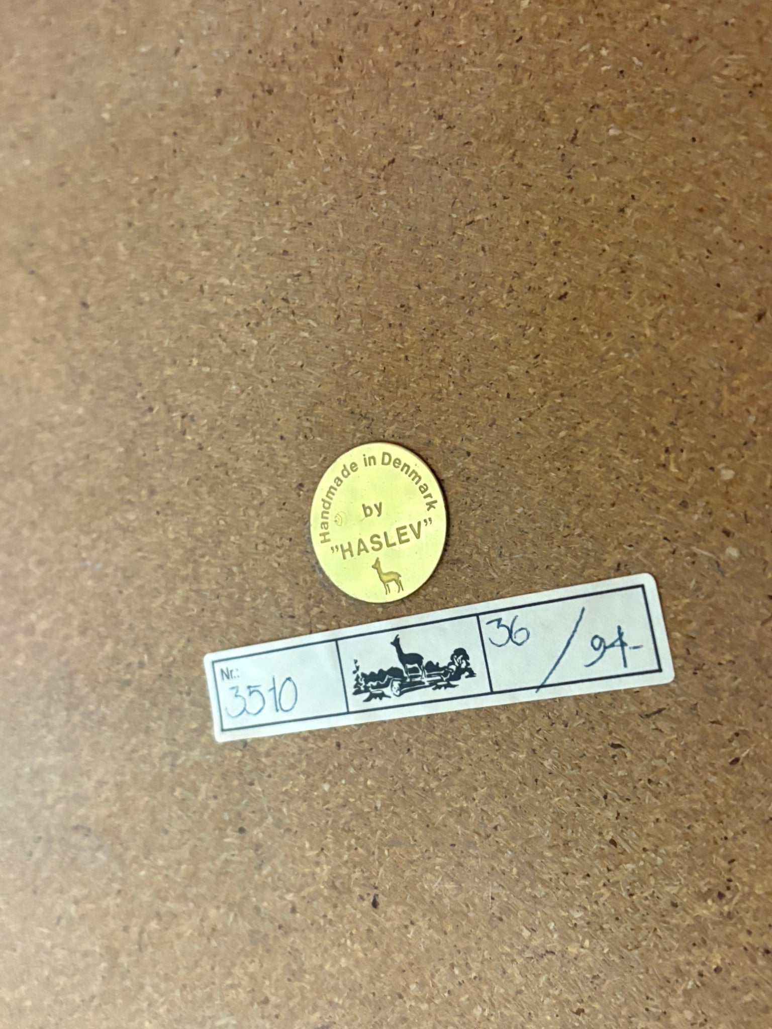 Haslev 家具常附有專屬的 品牌標示:印有 鹿徽章 的金屬貼片或是標示型號與檢驗編號的紙標籤。這些細節不僅是 真品與產地的保證,也成為收藏市場辨識 Haslev 家具的重要依據,讓作品更具收藏與流通價值。