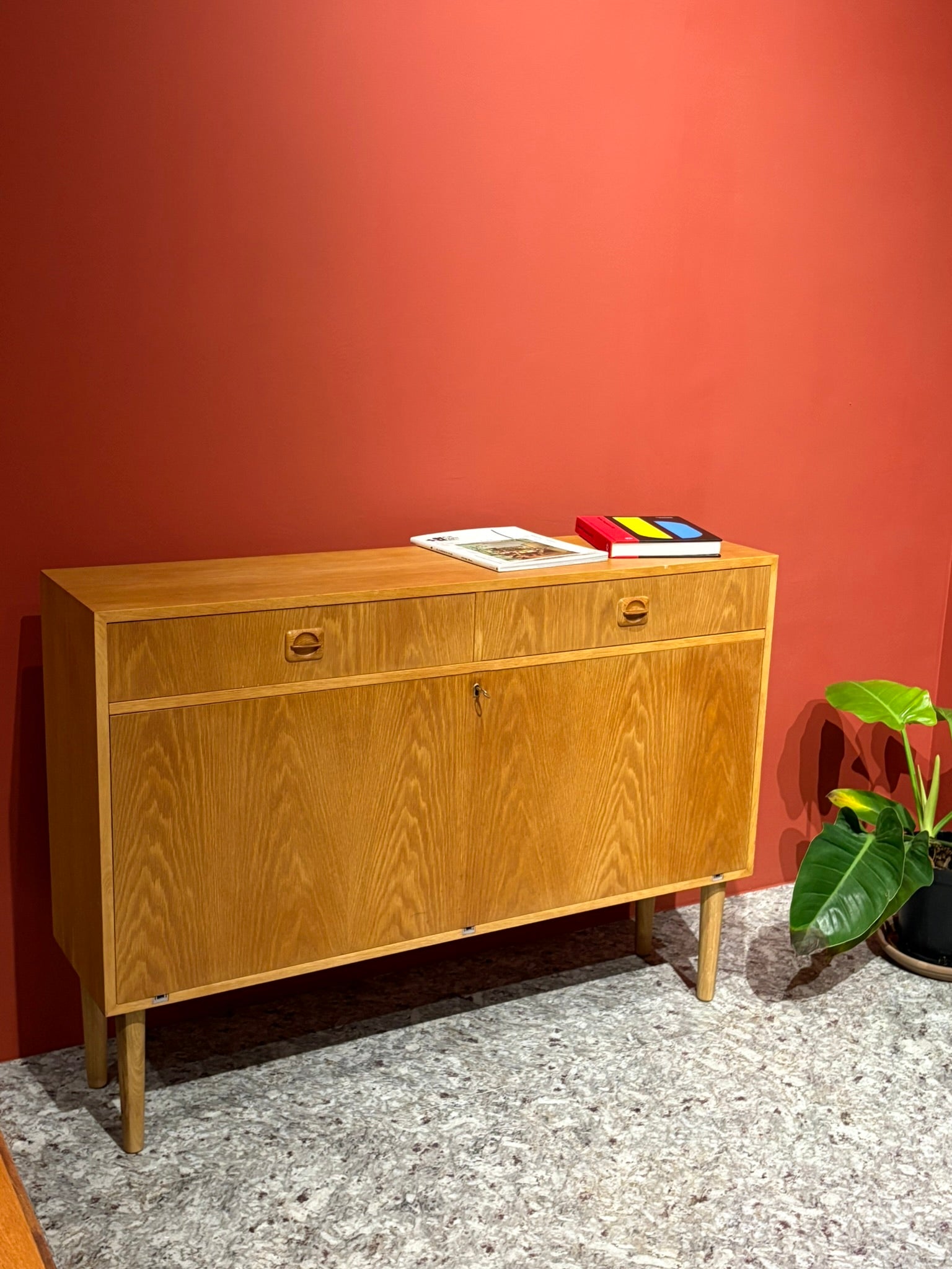 這件橡木邊櫃(Sideboard, Oak) 造型簡潔,線條俐落,整體比例修長,腿部略帶錐形,結構輕盈但穩固,展現當代工藝的細膩。手把部分以整塊木料雕刻成簡單幾何形,兼具裝飾與功能;這樣的設計在丹麥 1960s 家具中皆可見到,常用於餐邊櫃或玄關收納櫃用途。內部空間充足,適合收納餐具、書籍或日常用品。