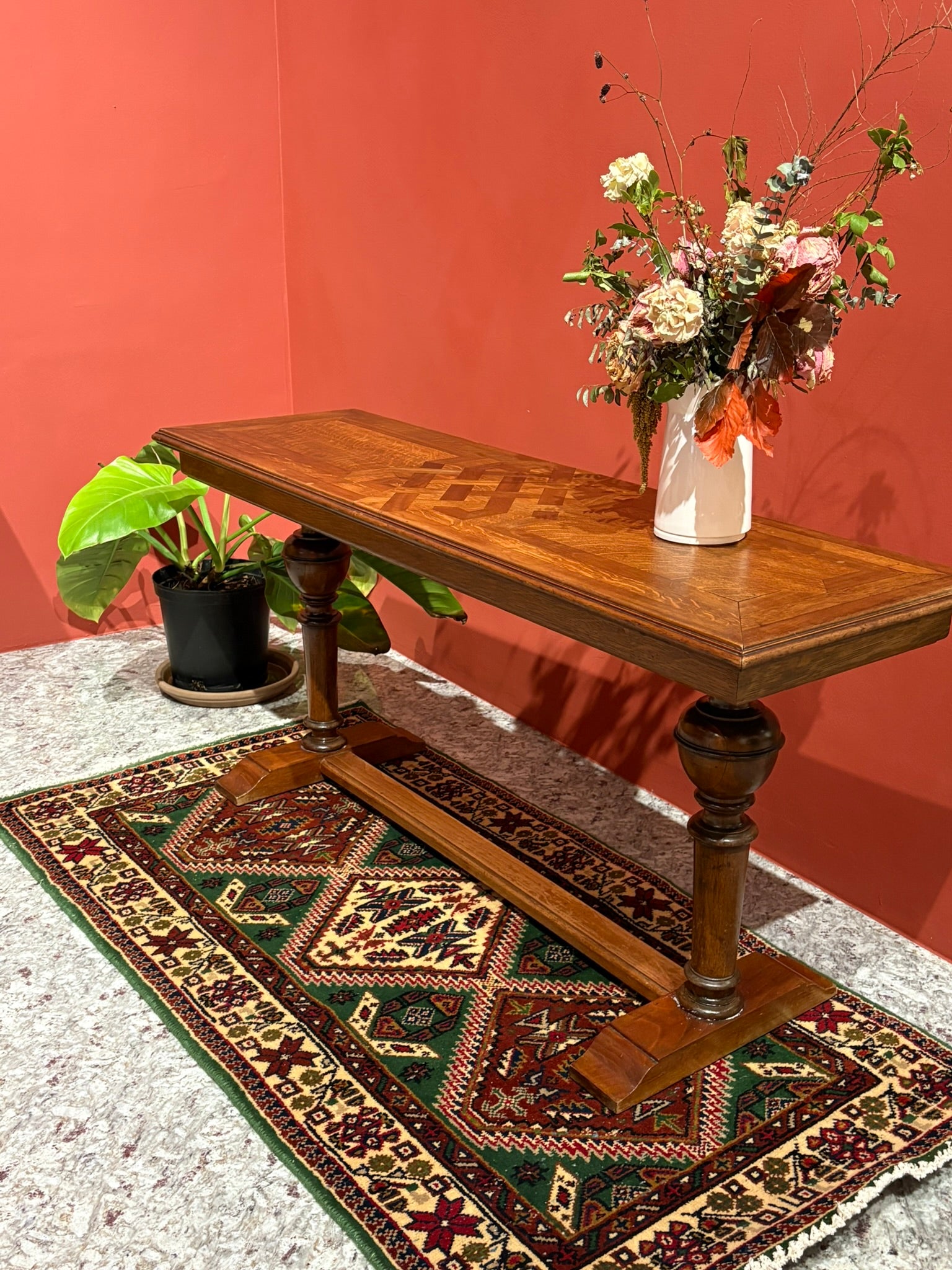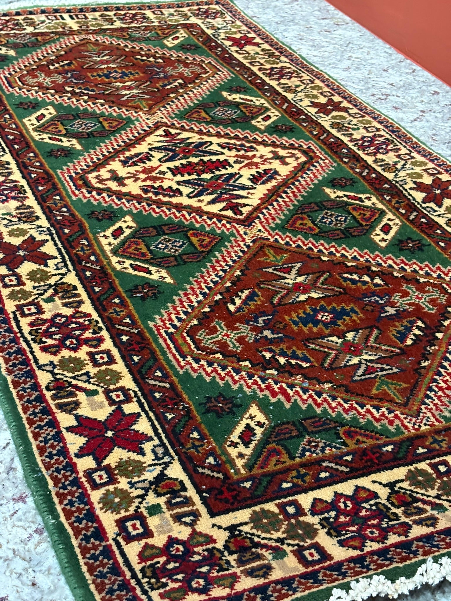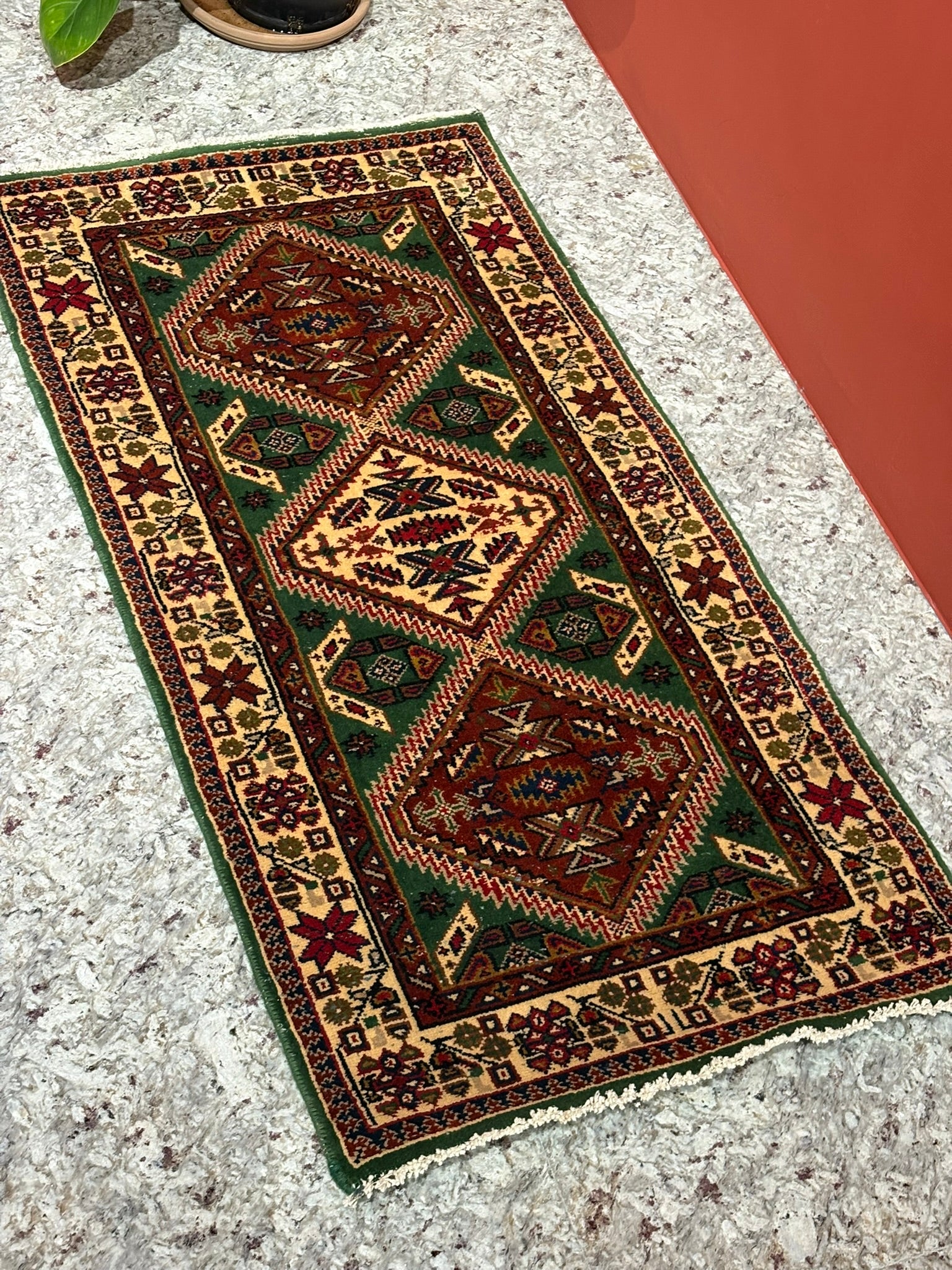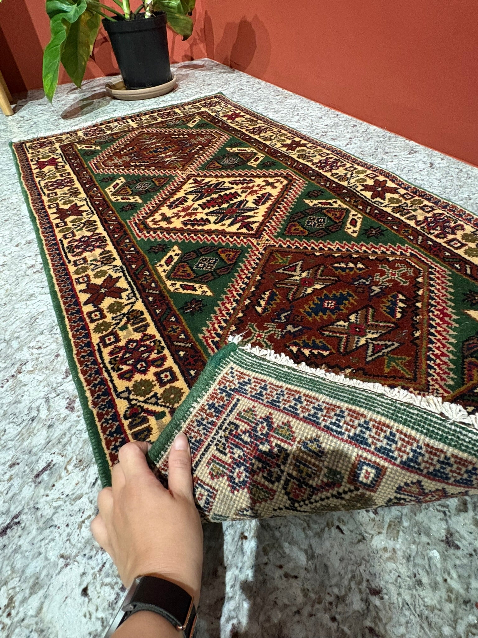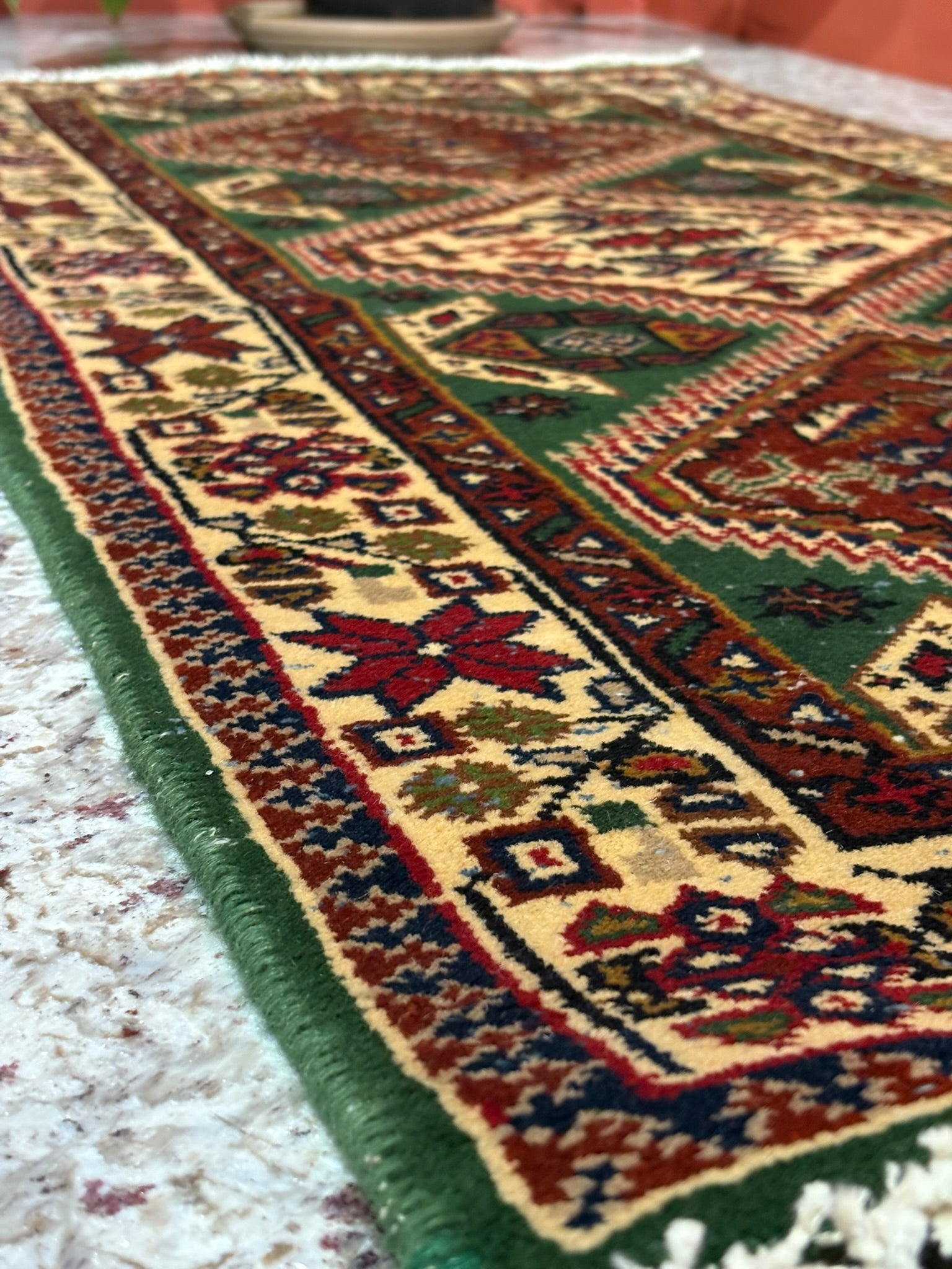 這張來自印度的復古手織地毯,以綠色為主調,交織象牙白、赤陶紅、棕色與海軍藍等多重色線,形成少見而迷人的配色。乍看濃烈,實際置於空間中卻顯得柔和平衡,能自然融入木質家具與植物色系中。