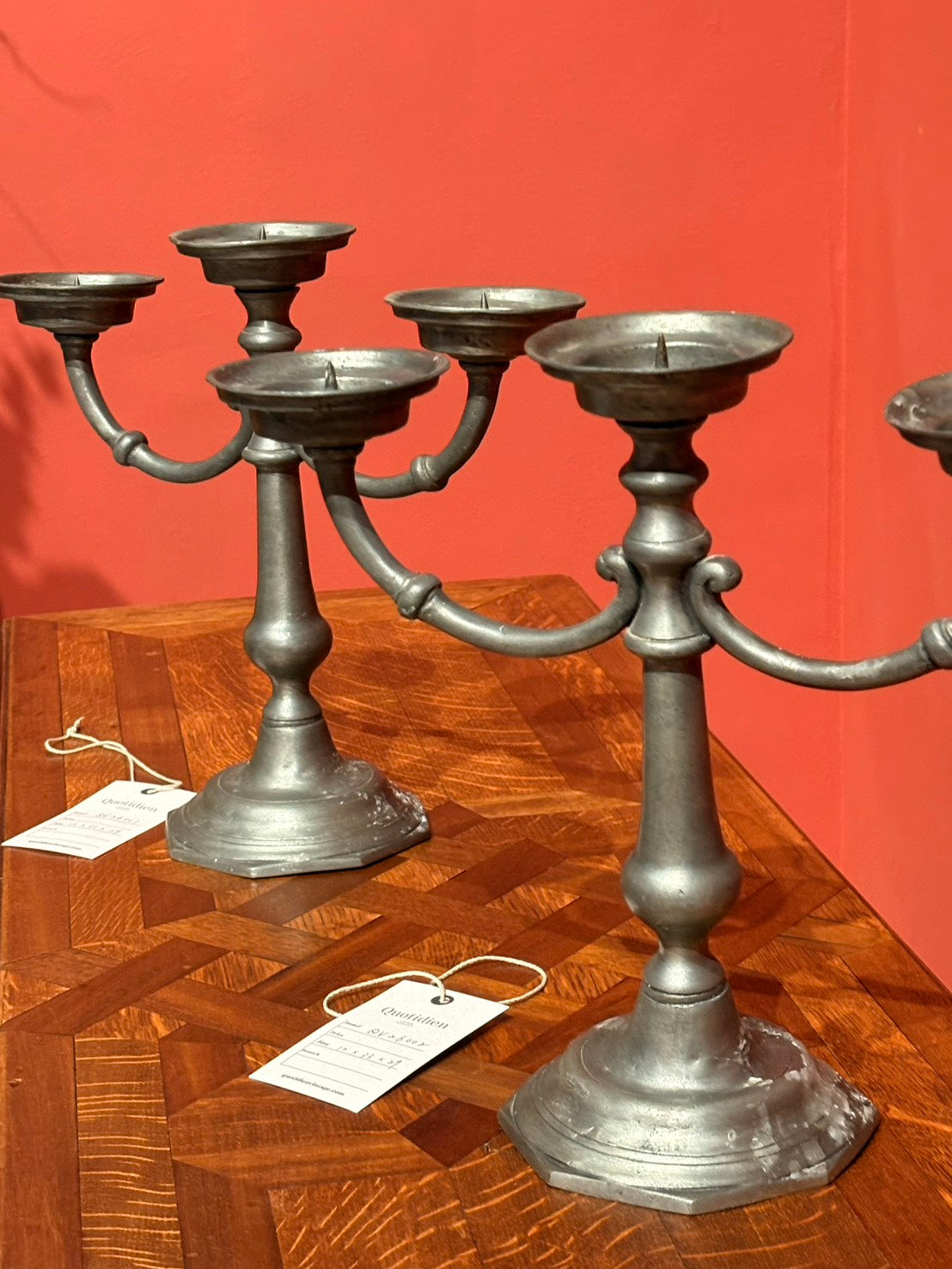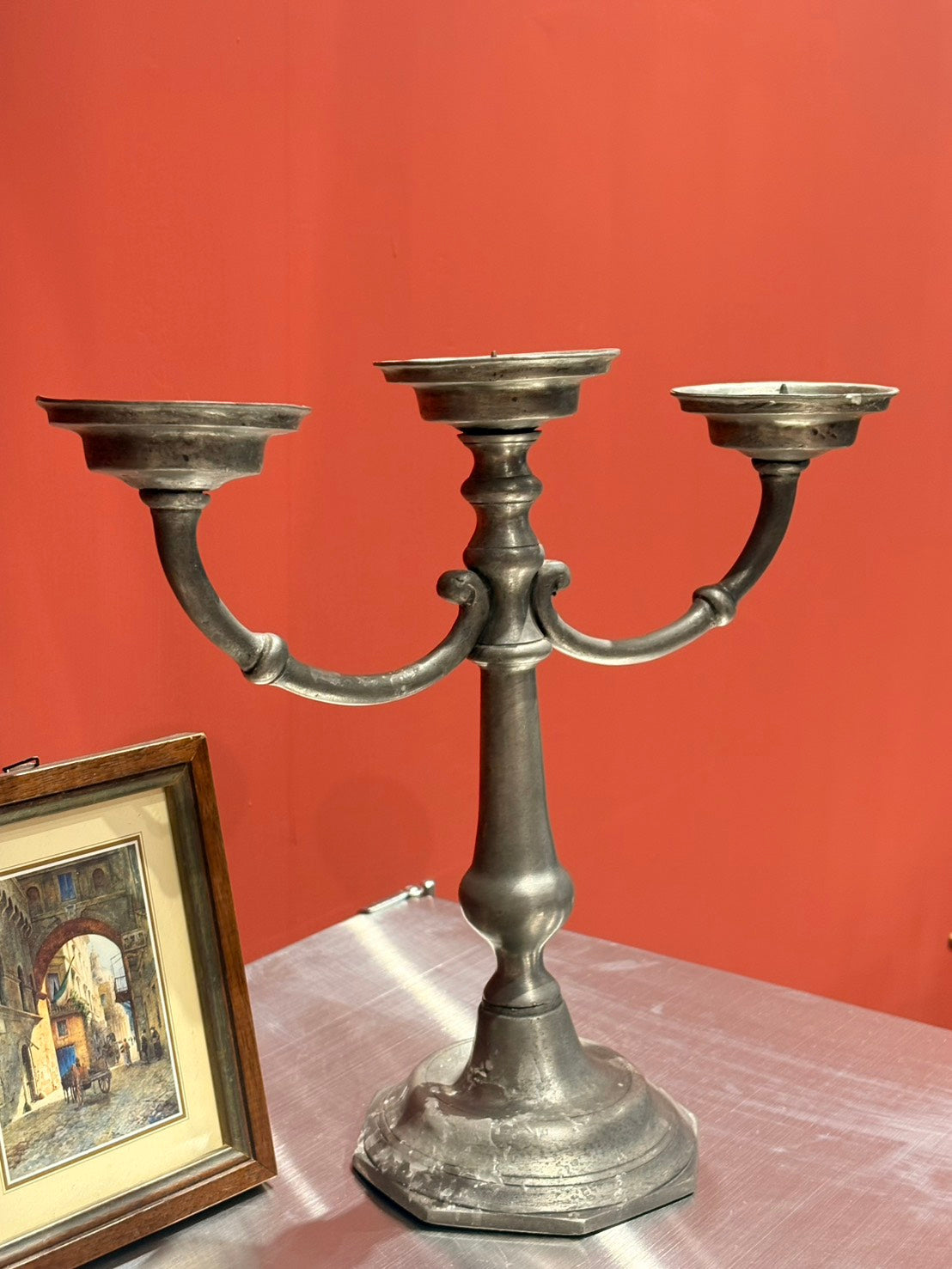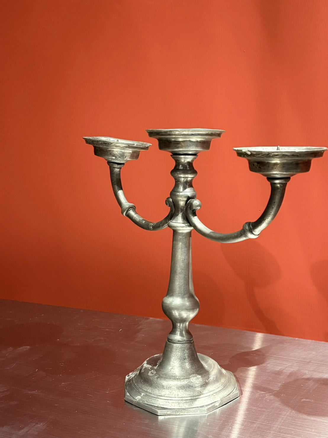 三臂錫製燭台,約為 1970 年代 France 製作之錫器老件。底部附原廠工坊鋼印,標示 「95% Étain Fin」,代表使用高純度精錫合金。