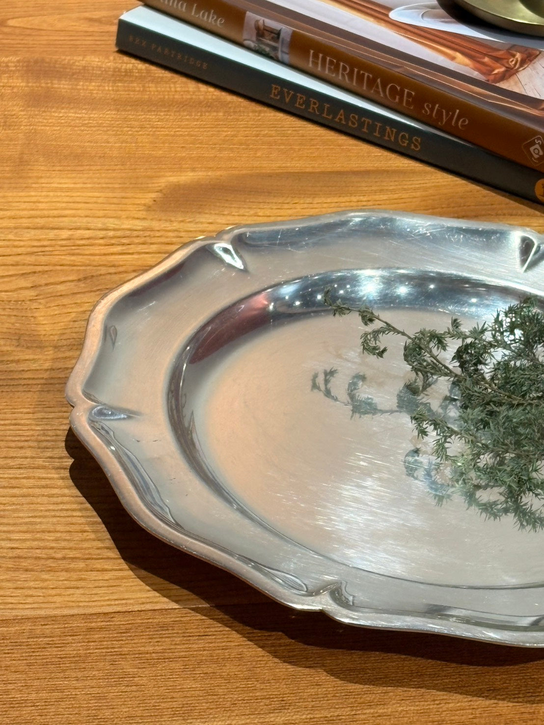圓形銀盤,盤面開闊,邊緣以連續起伏的線條圍合,造型典雅。銀質表面可見細緻刮痕與自然拋光痕跡,在日常光線下呈現柔和而沉穩的亮度。