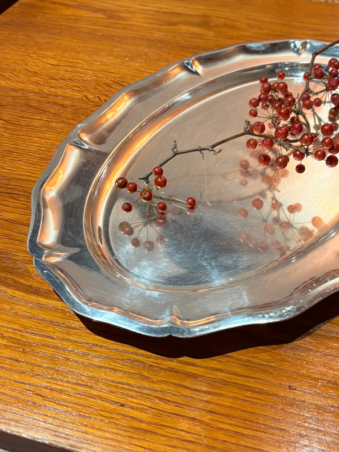橢圓形銀盤,線條流暢,盤緣起伏收折,造型典雅而不繁複。盤面比例修長,中央留白寬廣,反射出柔和而穩定的金屬光澤,表面可見細微使用痕跡,為銀器隨時間累積的自然狀態。