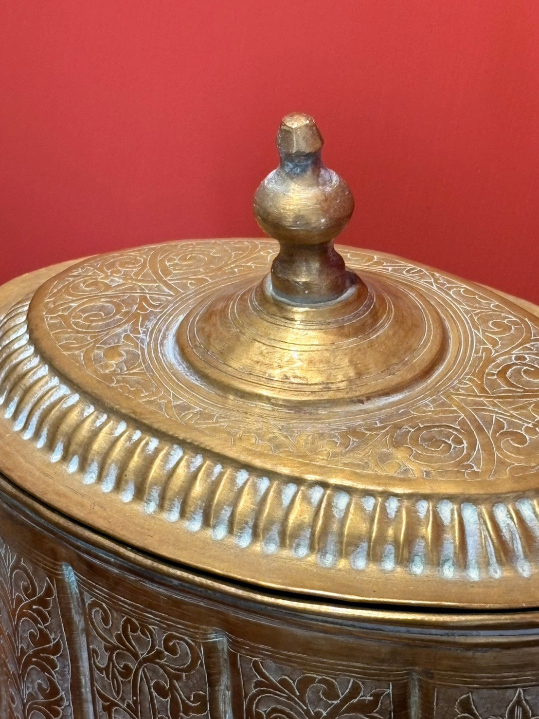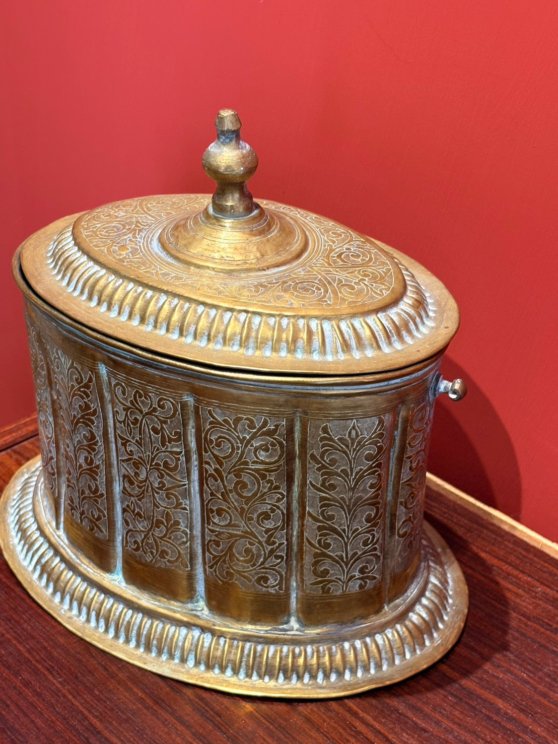 19世紀後期至20世紀初,東方裝飾風格在歐洲與殖民地區廣泛流行,金屬器物常融合伊斯蘭卷草紋(Arabesque)元素與西式對稱造型設計。此類圓筒形儲存器多用於茶葉、菸草或乾貨保存,同時亦作為客廳與茶桌陳設器物,兼具實用與裝飾功能。