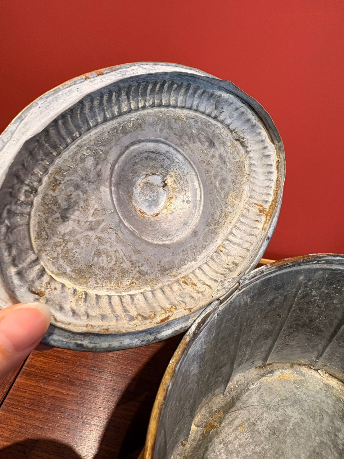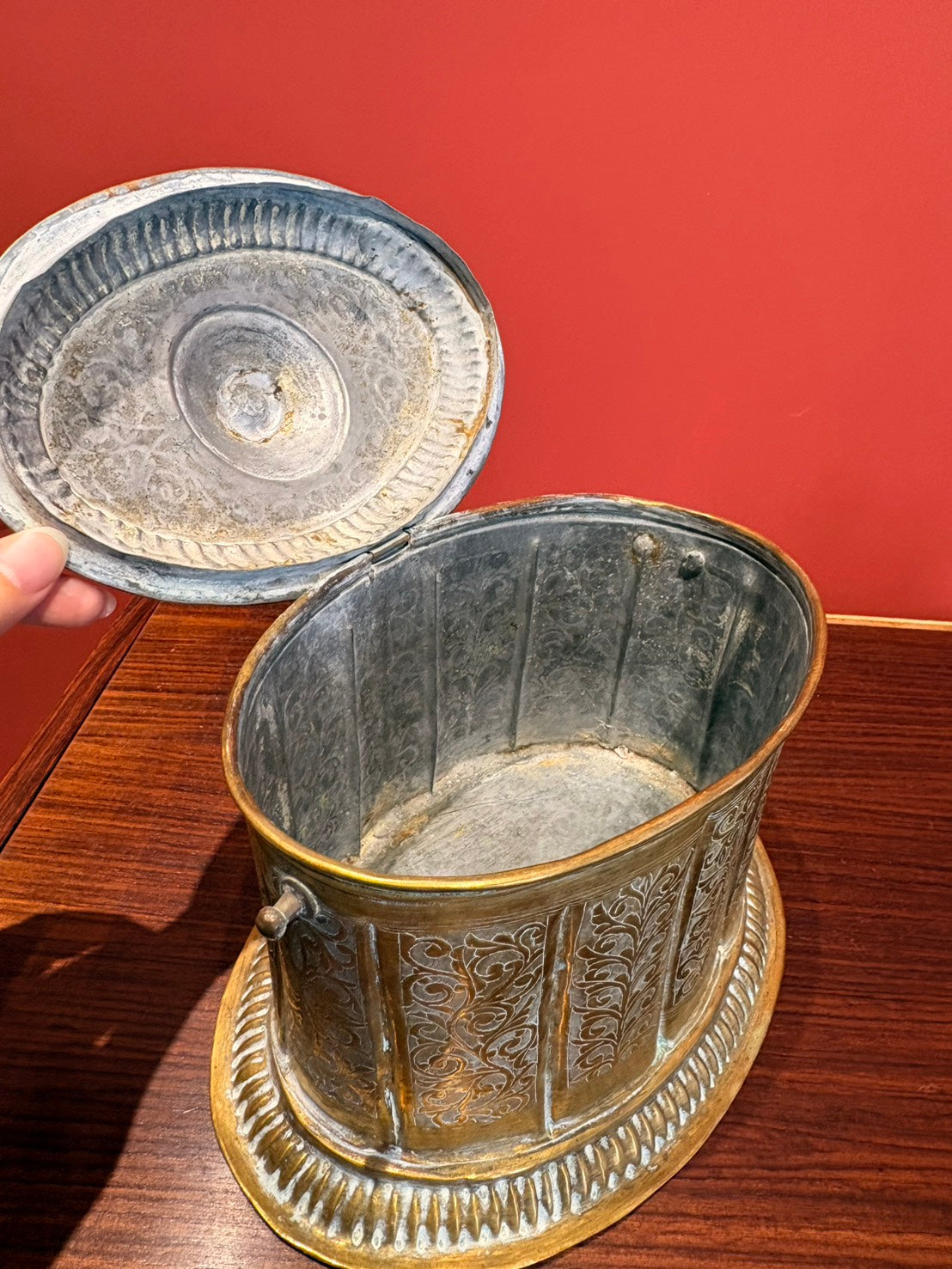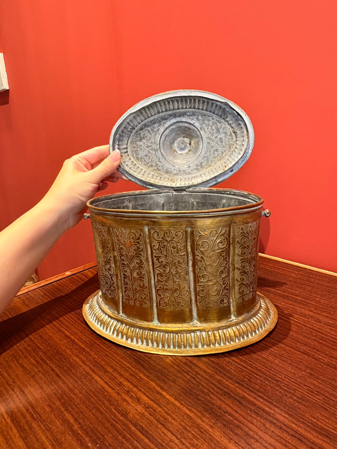 此件購於南法鄉村。器身以黃銅板捲製成形,手工刻紋清晰可辨,卷草紋飾與壓紋底座層次分明,整體呈現東西融合的裝飾風格與平衡比例。表面保有自然氧化色澤與歲月痕跡,內部可見年代使用痕跡與局部老化,反映長時間保存下的自然狀態。
