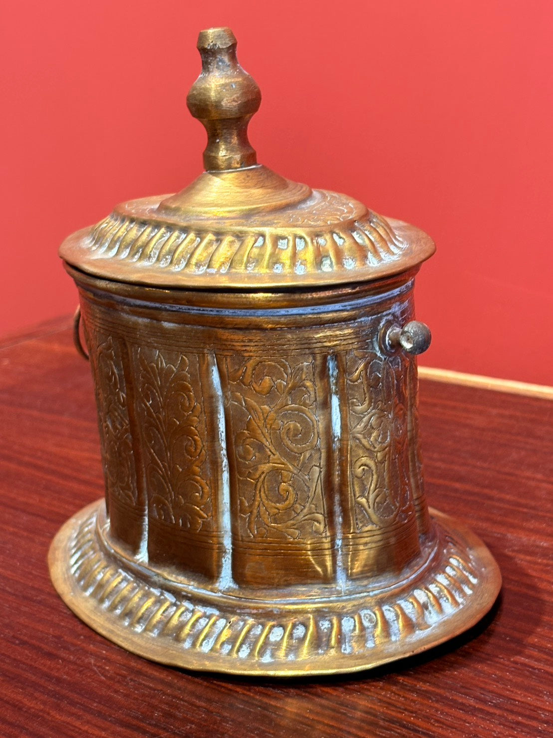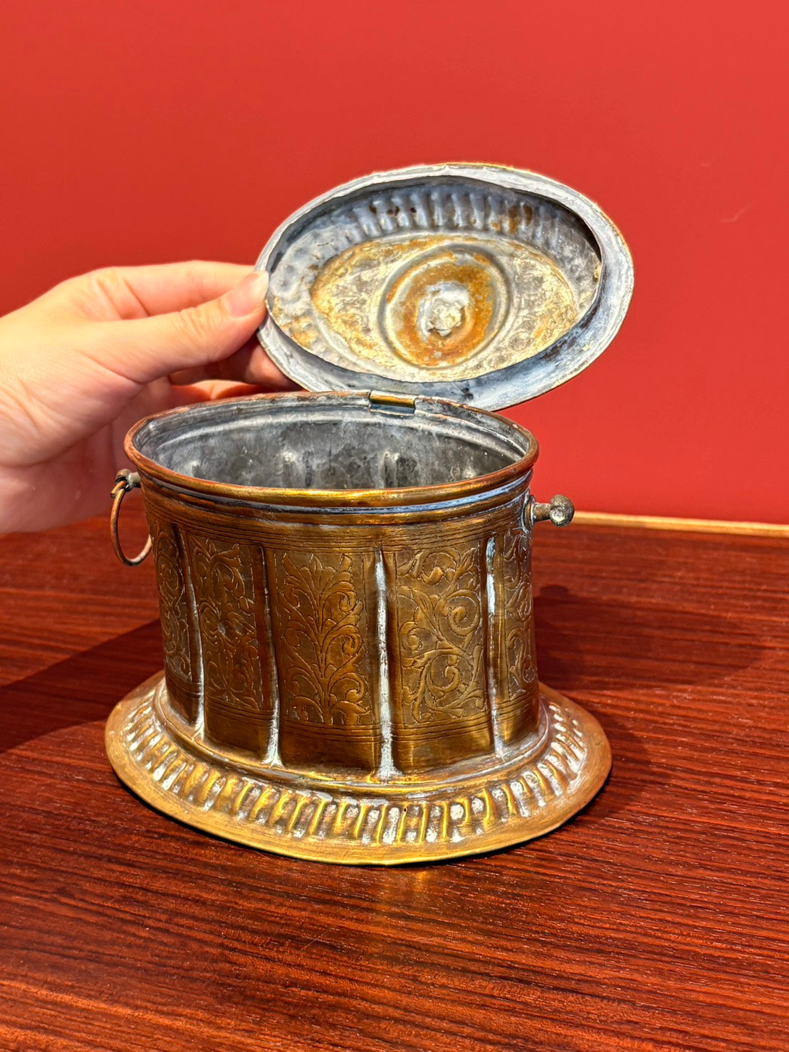 此件購於南法鄉村。器身以黃銅板捲製成形,手工刻紋清晰可辨,卷草紋飾與壓紋底座層次分明,整體呈現東西融合的裝飾風格與平衡比例。表面保有自然氧化色澤與歲月痕跡,內部可見年代使用痕跡與局部老化,反映長時間保存下的自然狀態。