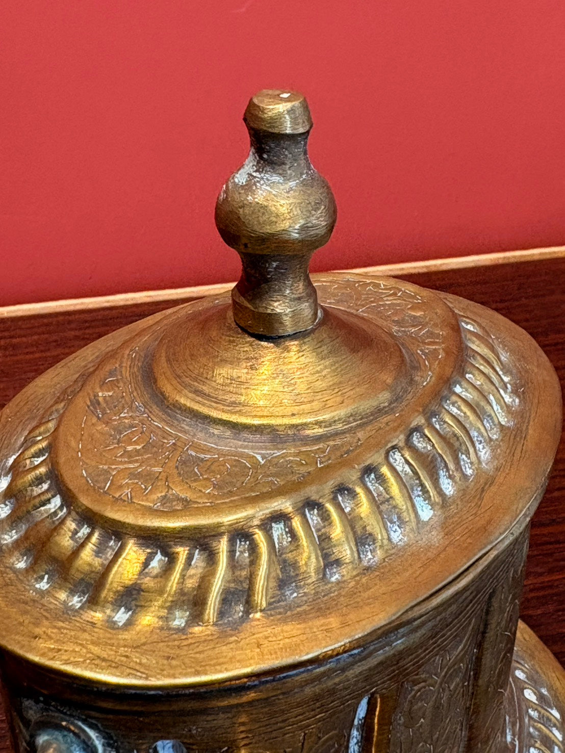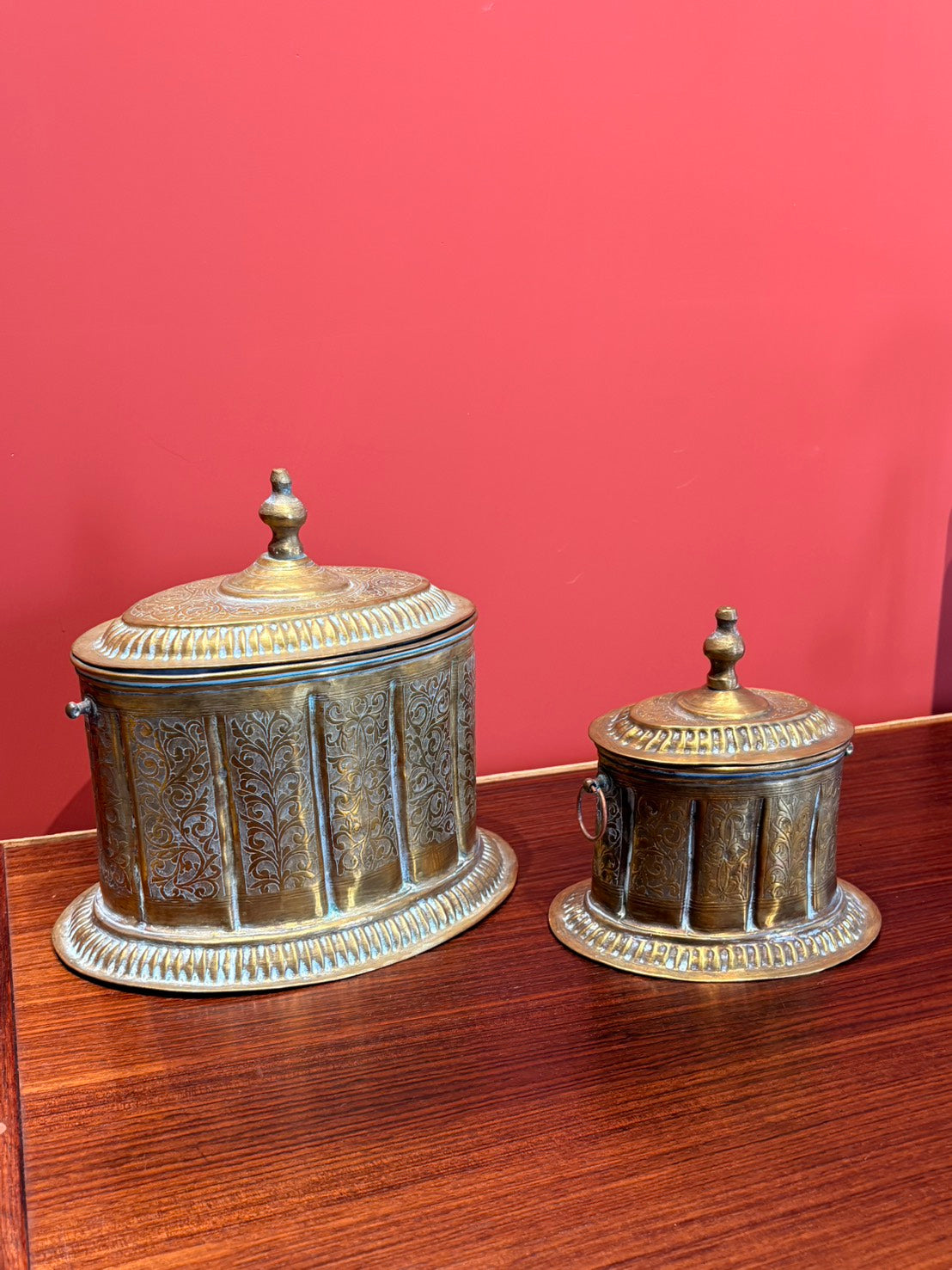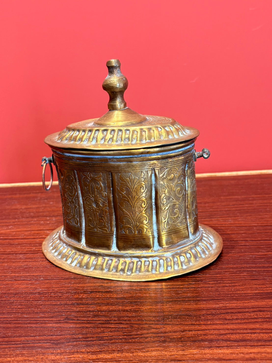 19世紀後期至20世紀初,東方裝飾風格在歐洲與殖民地區廣泛流行,金屬器物常融合伊斯蘭卷草紋(Arabesque)元素與西式對稱造型設計。此類圓筒形儲存器多用於茶葉、菸草或乾貨保存,同時亦作為客廳與茶桌陳設器物,兼具實用與裝飾功能。