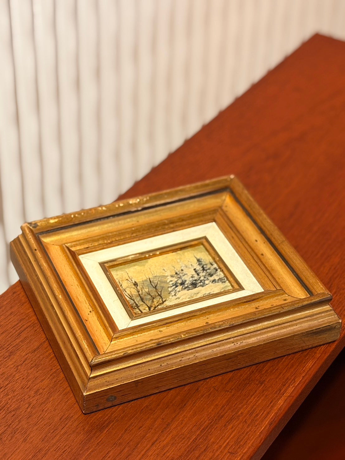 作品尺寸約 9 × 7 cm,,鑲嵌在原裝的義大利古典木框中。 作品背面附有原始真跡證書(Certificato di Autenticità),並加蓋義大利「Federazione Nazionale Esperti Critici d’Arte」鋼印。該聯合會為 20 世紀後半葉活躍於義大利藝術市場的藝術專家與評論者協會,主要為畫廊流通作品提供作者與基本資料之確認文件。此類證書在當時義大利藝術市場中相當常見,屬於畫廊體系內的專業鑑定資料,可用以核對作品名稱、媒材、尺寸與創作年份。