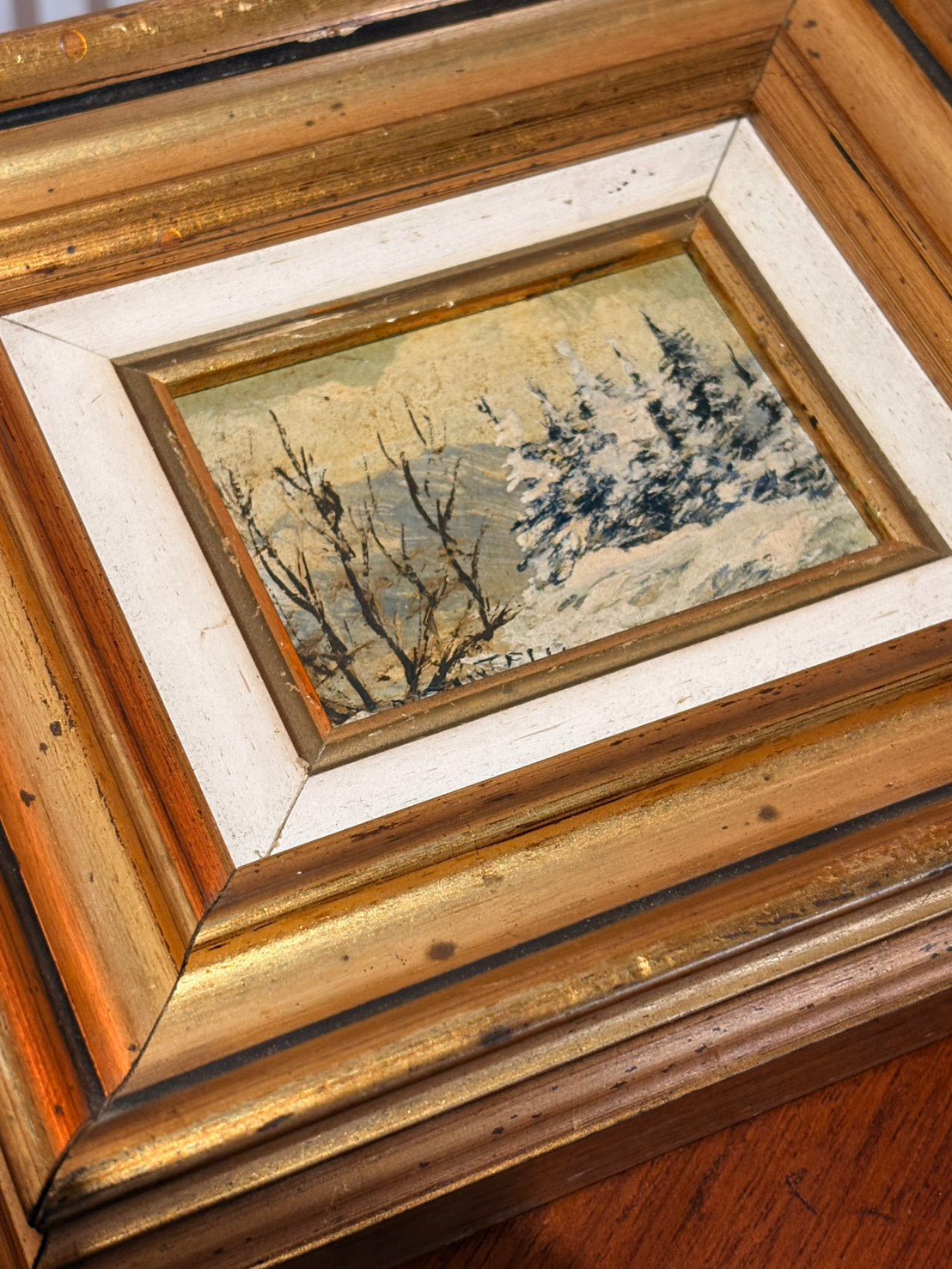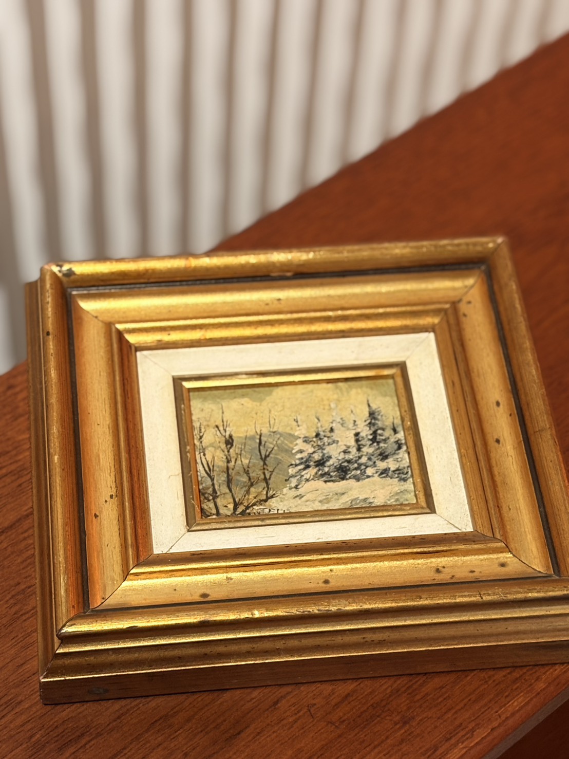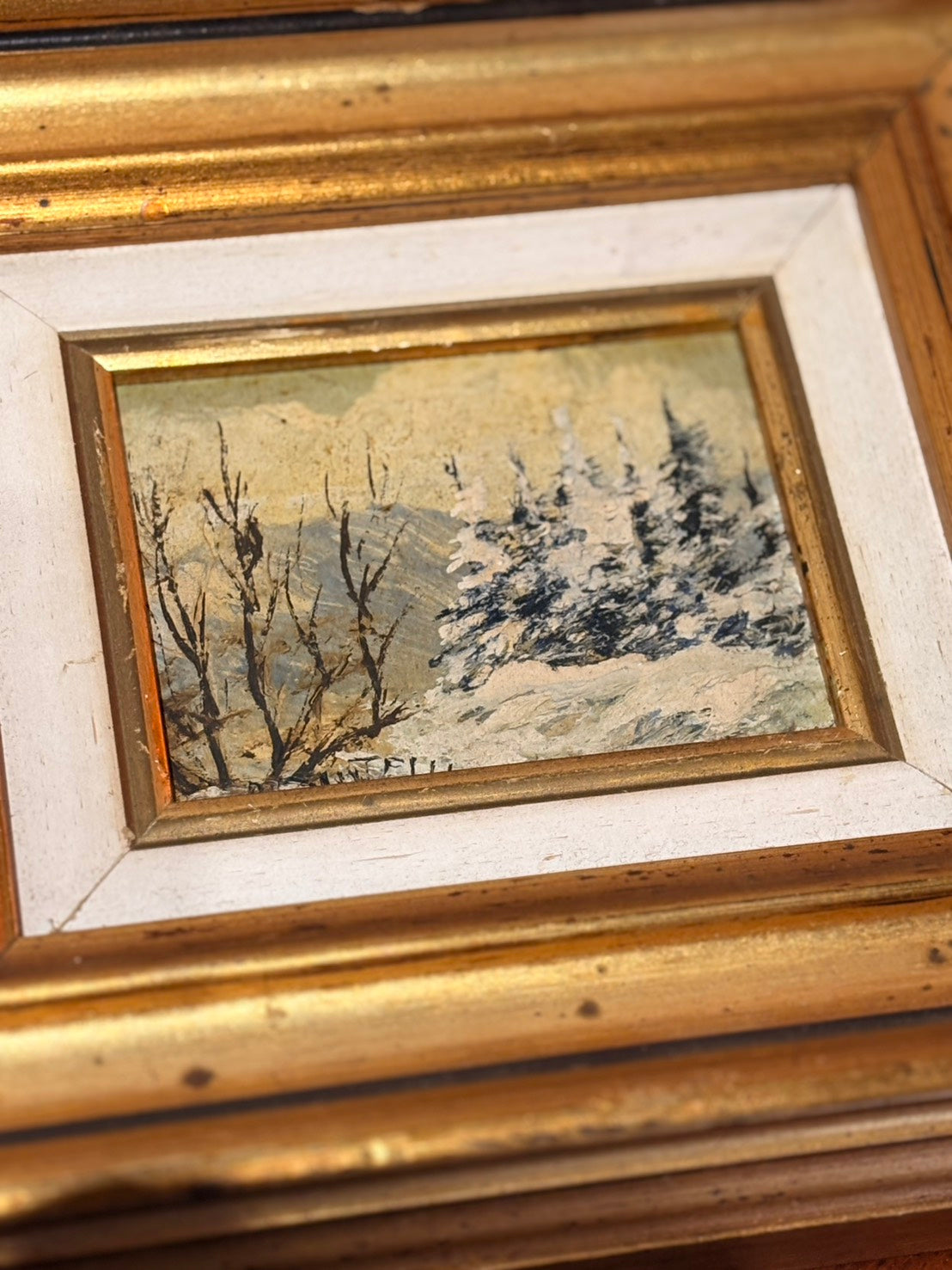 這是一幅來自義大利的原作小品油畫《雪》(Neve),完成於 1991 年,作者為畫家 Renato Cantelli。畫面描繪冬日山林景象:前景枯枝交錯,積雪覆蓋的松樹在寒色天空下形成層層深淺,遠山以薄霧處理,帶出靜謐而清冷的氛圍。畫家以厚薄交替的筆觸表現雪的質感,白色顏料在樹梢處略帶立體堆疊,與柔和的背景形成對比,呈現典型歐洲風景小油畫的光影層次。