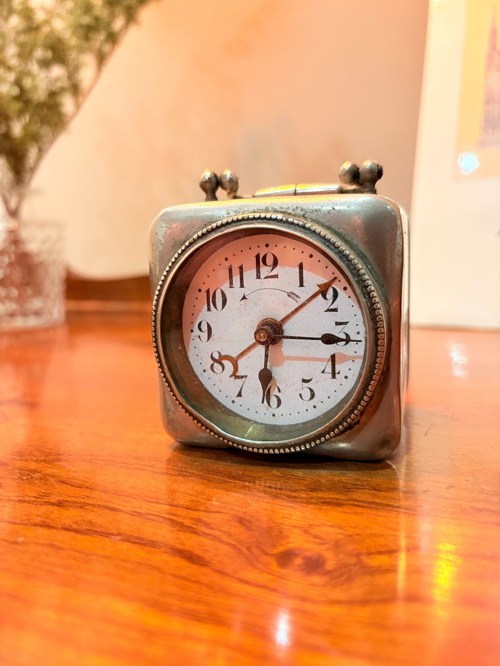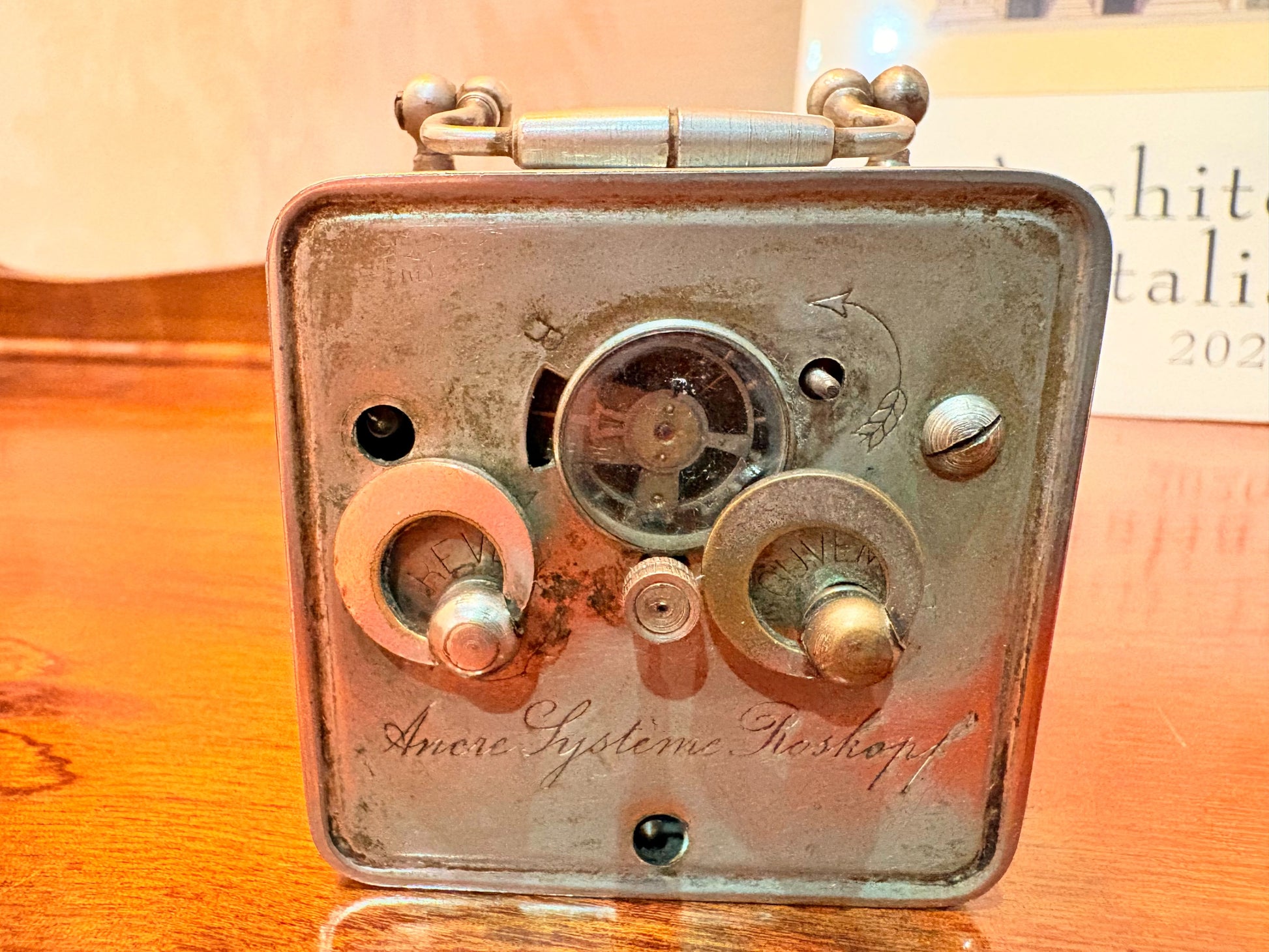 此件為約1900年前後之機械式旅行鬧鐘,背板刻有「Ancre Système Roskopf」字樣,為Roskopf系統之錨式擒縱結構。此類刻有「Ancre Système Roskopf」的旅行鬧鐘,出現於19世紀末至20世紀初機械時計逐漸普及的時期。相較早期結構簡單的Roskopf時計,已可見較成熟的調速裝置與標準化外殼形式,反映當時時計製造由手工製作走向分工量產的背景。其方形提把式設計與法文調速標示,為歐陸市場常見樣式,可視為1900年前後旅行鬧鐘的代表型制之一。