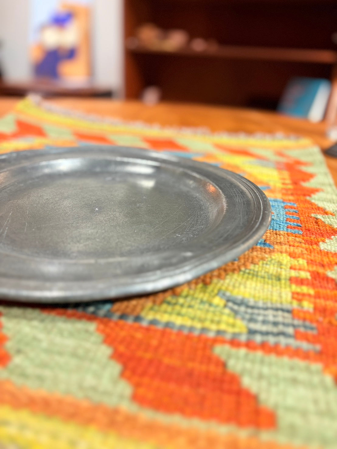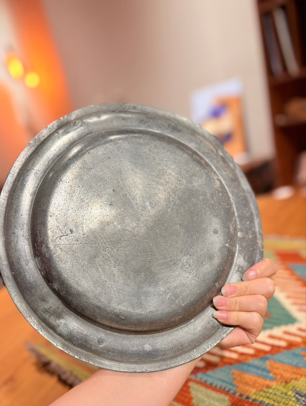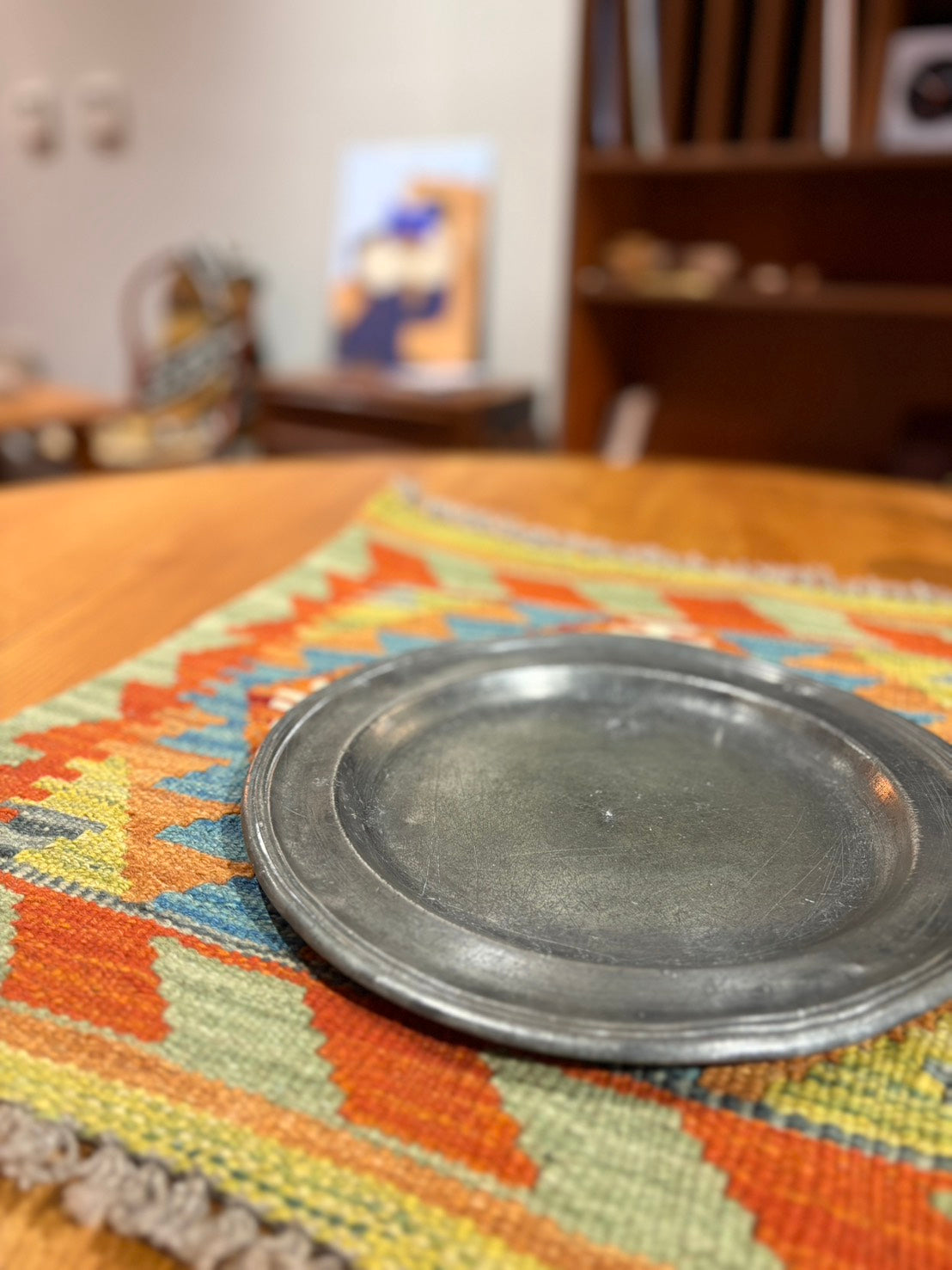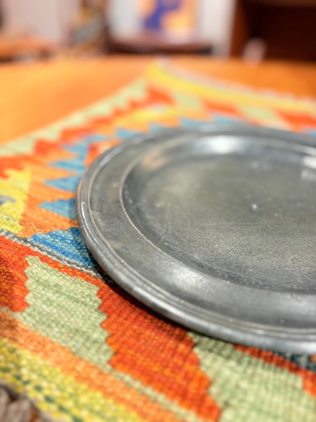 來自 18 世紀修道院的錫盤。器形寬厚,邊緣低調收斂。 金屬表面經歲月使用,呈現柔和而深沉的光澤,細微痕跡如時間所留下的層次。