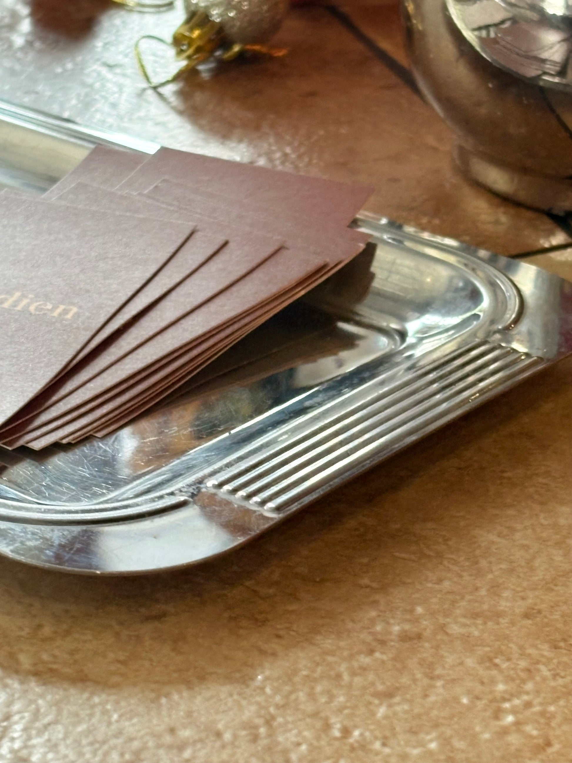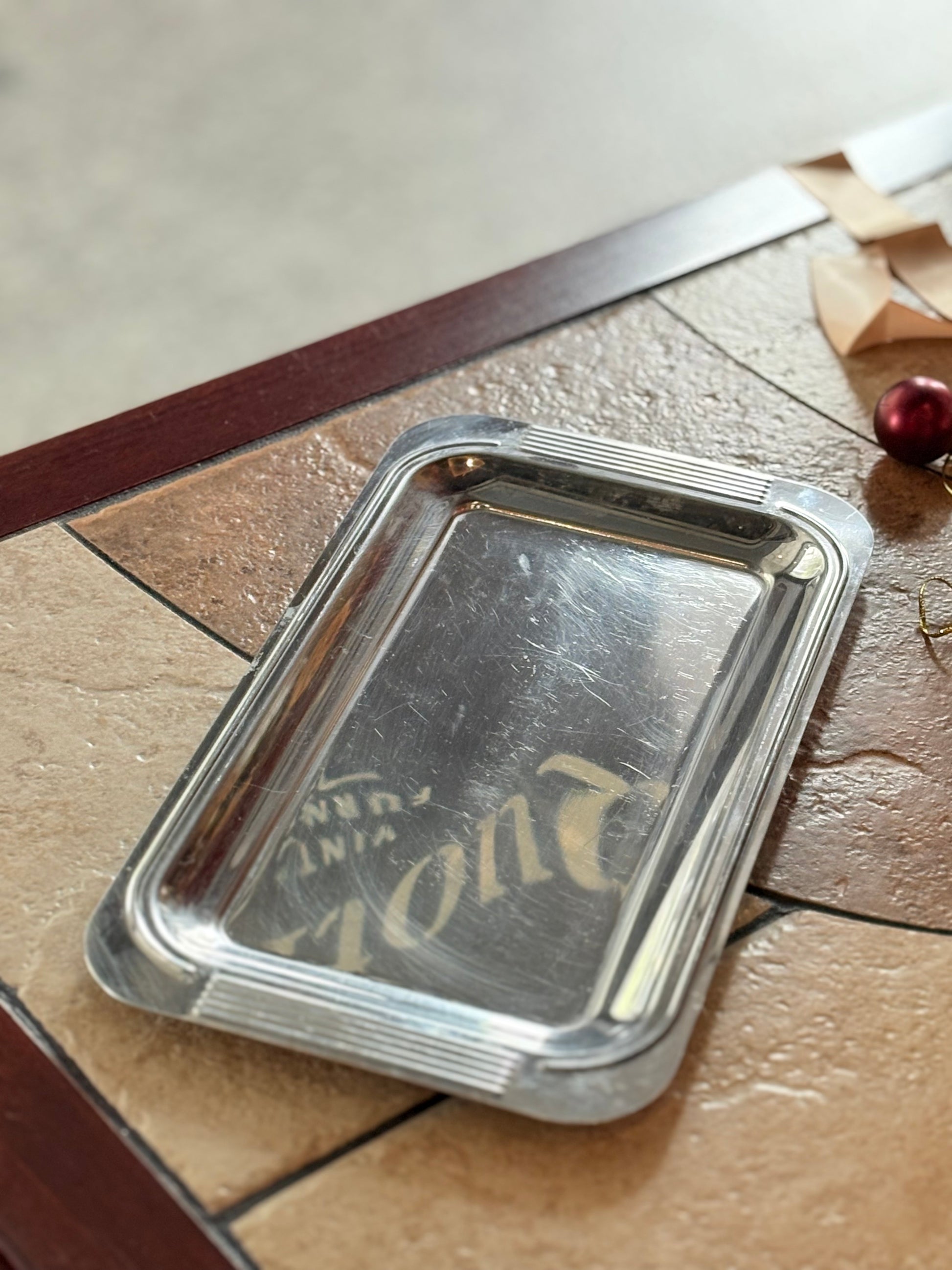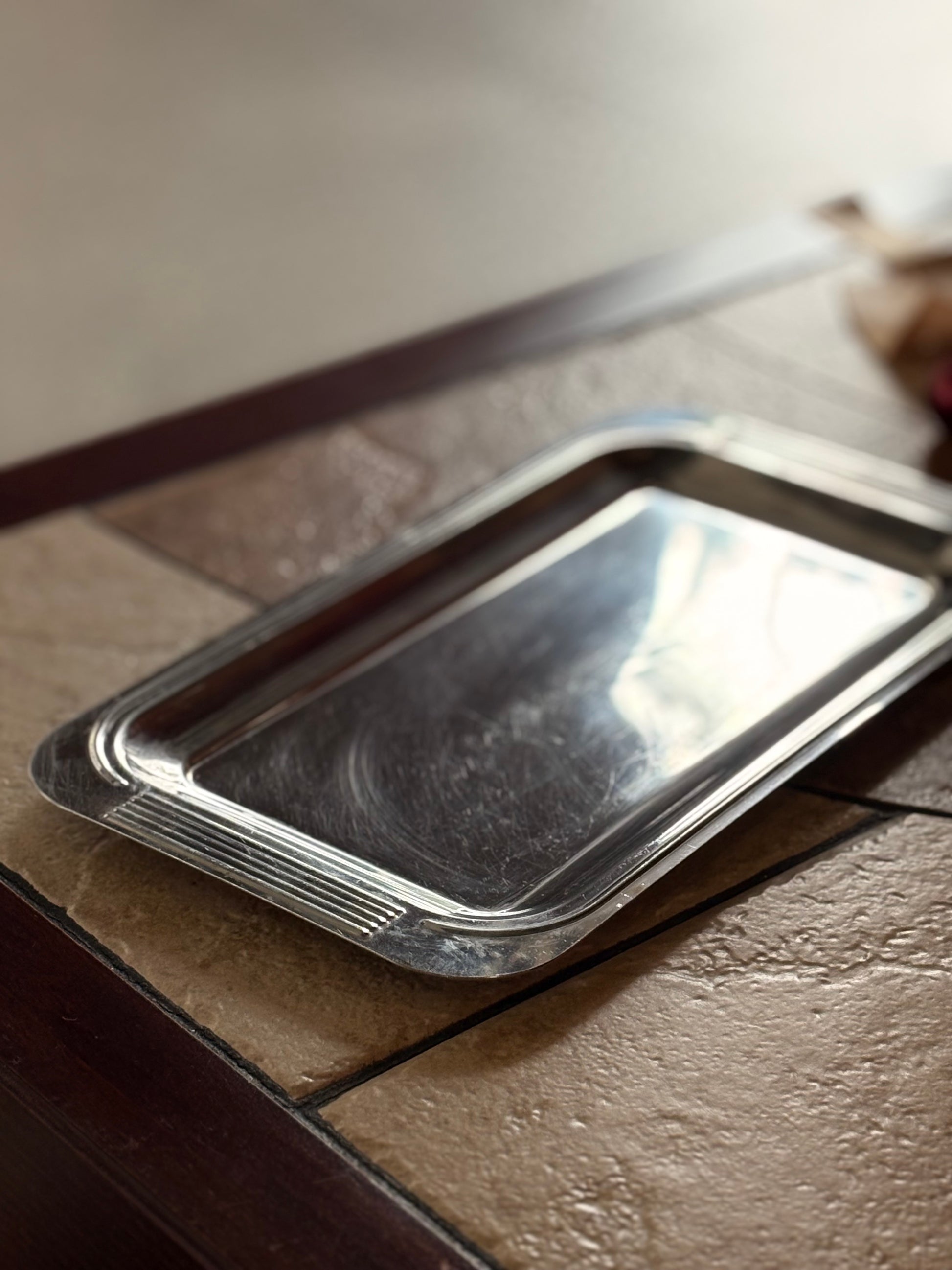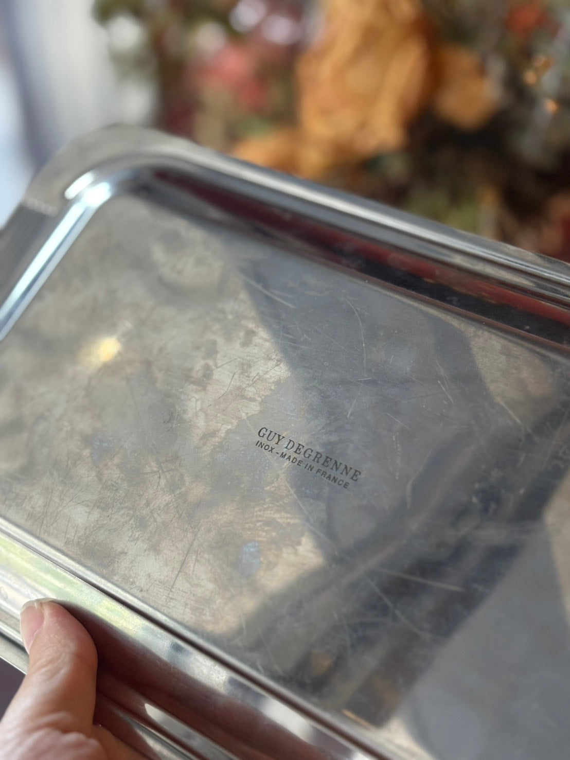GUY DEGRENNE 法國製不鏽鋼長方托盤,低調光澤映射出細膩質感,尺寸小巧精緻、比例勻稱。底部清晰刻有「INOX – MADE IN FRANCE」標示。INOX 為法文「inoxydable」之縮寫,意指不易氧化之不鏽鋼,在歐洲多用於標示食品接觸等級材質,亦為品牌經典金屬製品所採用之標準。