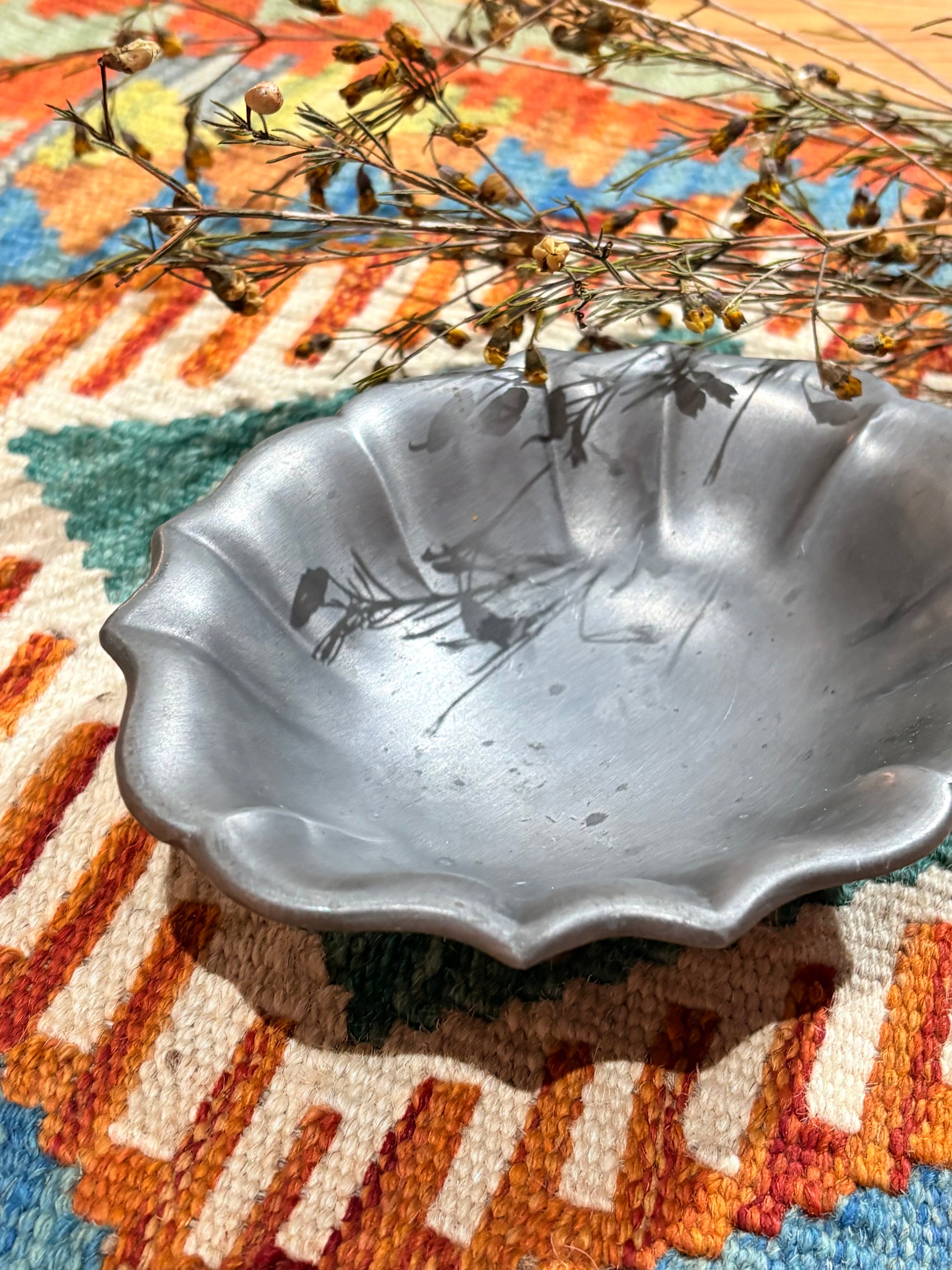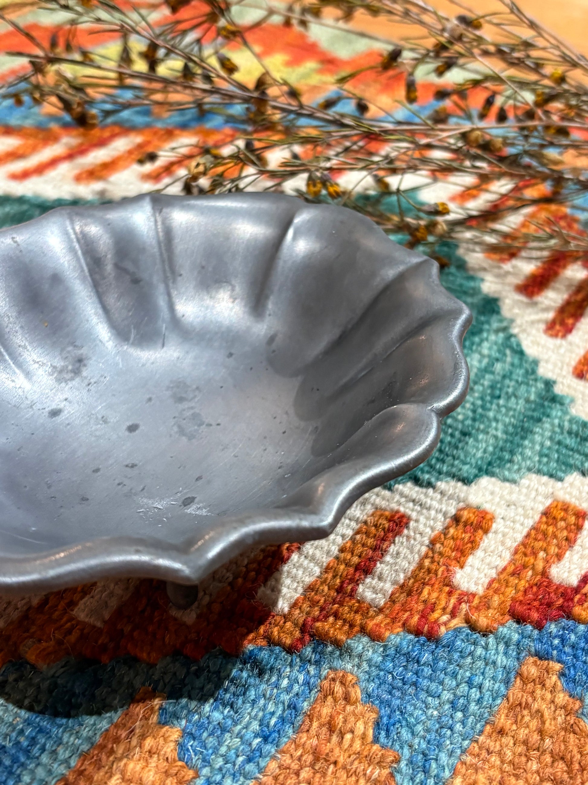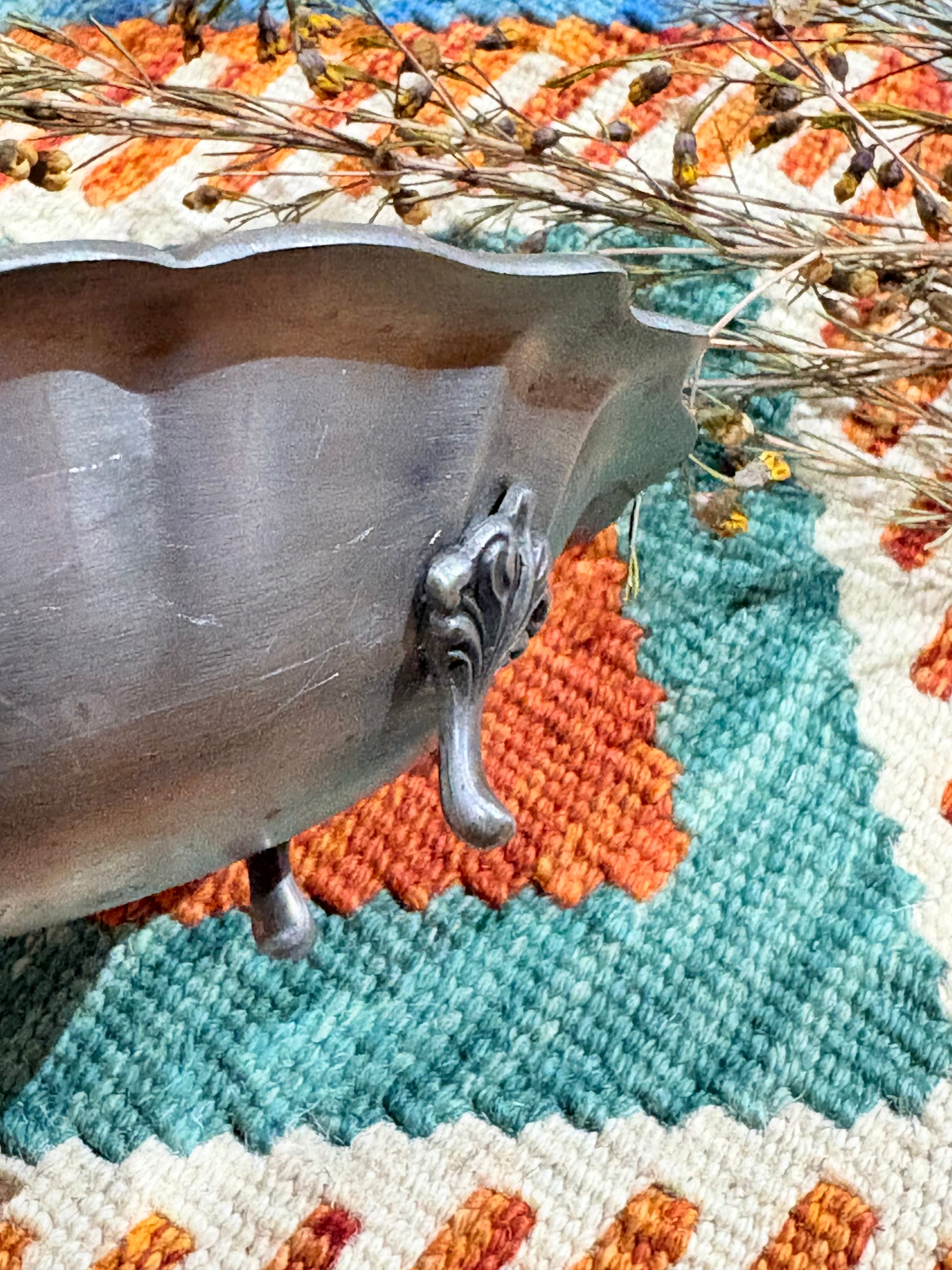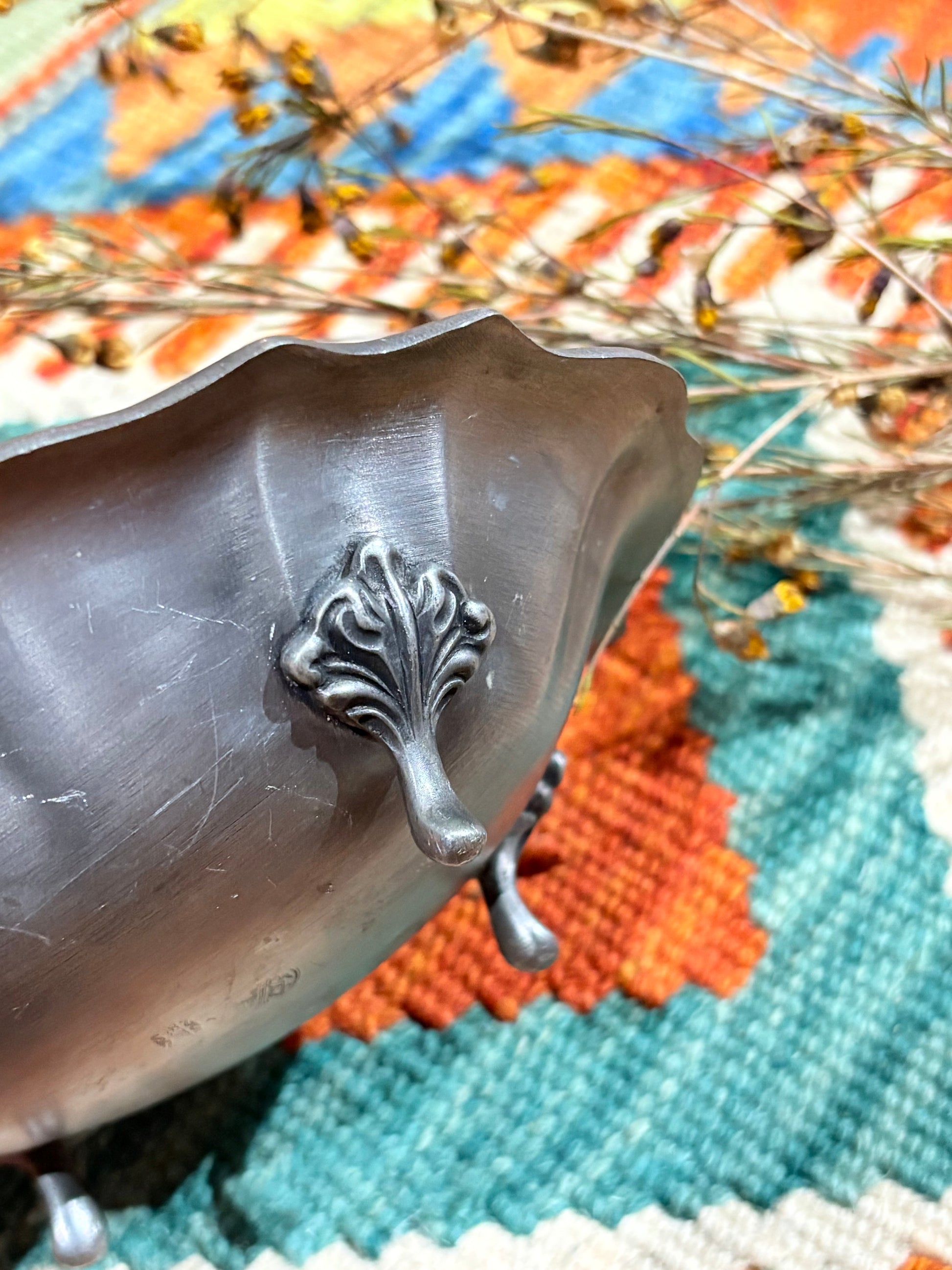 碗身以柔和起伏的波浪花邊為輪廓,表面經細緻霧面拉絲處理,呈現沉穩而溫潤的銀灰光澤。底部採四足結構,裝飾腳運用文藝復興風格之 Acanthus(莨苕葉)葉形元素,簡約曲線,比例典雅含蓄,展現古典的內斂詮釋。